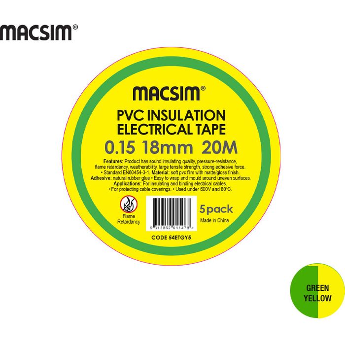 0.15 x 18mm x 20m PVC ELEC TAPE GREEN/YELLOW 5PK